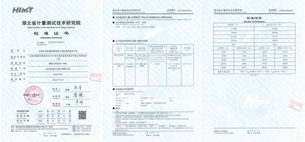 2025年7月16日,湖北省計量測試技術研究院正式簽發(fā)了編號為2025DW008600361的校準證書,完成了對武漢凱迪正大電氣有限公司研制生產(chǎn)的KDZD886C蓄電池充放電一體機的計量校準工作。