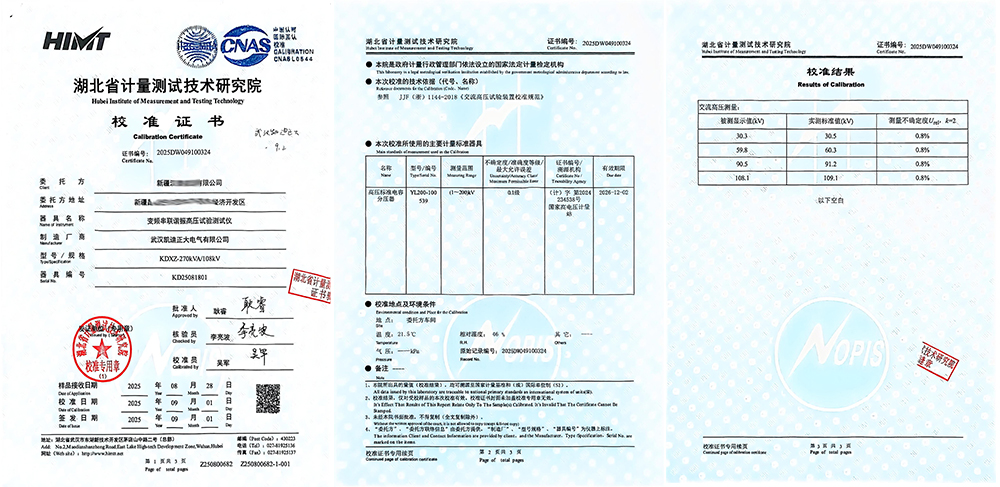 近期,新疆某能源公司采購了由武漢凱迪正大電氣有限公司生產(chǎn)的KDXZ-270kVA/108kV變頻串聯(lián)諧振試驗裝置。該設(shè)備經(jīng)湖北省計量測試技術(shù)研究院(省計量院)校準(zhǔn)并頒發(fā)證書(證書編號:2025DW049100324),此次校準(zhǔn)不僅標(biāo)志著該設(shè)備各項性能指標(biāo)符合行業(yè)規(guī)范要求,更凸顯了武漢凱迪正大在高壓電氣檢測設(shè)備領(lǐng)域的技術(shù)實力。