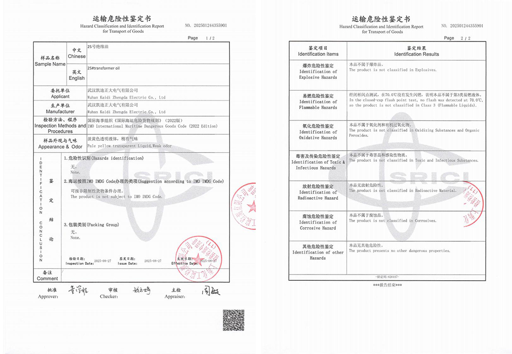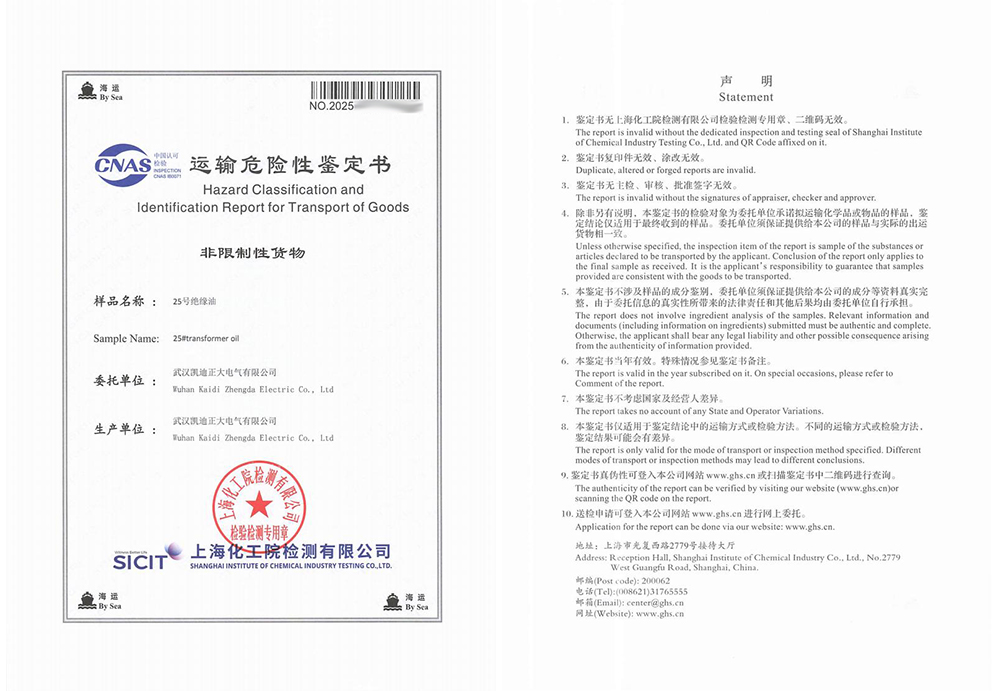 運輸危險性鑒定過程與結(jié)果詳解在國際海運中,危險品的運輸管理有著嚴格的標準與規(guī)范,油式試驗變壓器所用的絕緣油作為液體類物質(zhì),是否屬于易燃易爆危險品,需通過專業(yè)的運輸危險性鑒定予以確認。為此,武漢凱迪正大委托上?;ぴ簷z測有限公司對KD2675設備中使用的25號絕緣油進行了全面檢測。