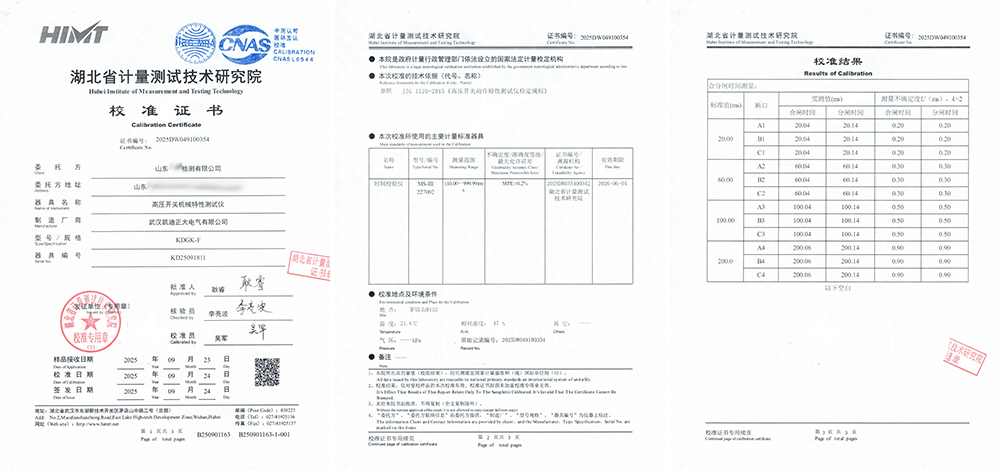 校準(zhǔn)方法: 使用院內(nèi)計(jì)量標(biāo)準(zhǔn)器具——MS-III型時間校驗(yàn)儀(證書編號:2025DW035400342)作為標(biāo)準(zhǔn)時間源,輸出一系列精確的標(biāo)準(zhǔn)時間信號(20.00ms, 60.00ms, 100.00ms, 200.0ms)模擬開關(guān)的合閘與分閘時間。