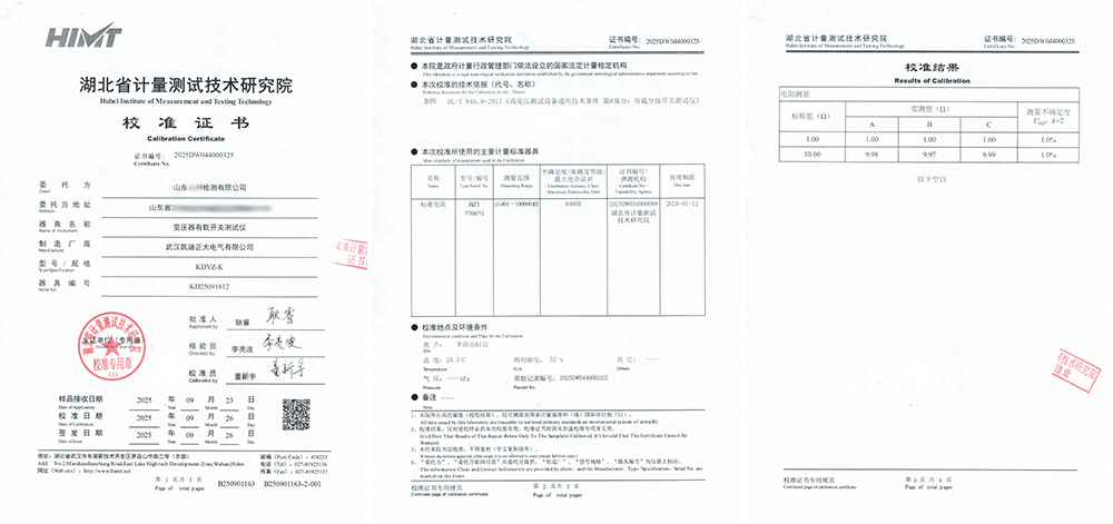 近日,山東某檢測有限公司引進(jìn)了由武漢凱迪正大電氣有限公司生產(chǎn)的KDGK-F高壓開關(guān)機(jī)械特性測試儀與KDYZ-K變壓器有載開關(guān)測試儀,并委托湖北省計(jì)量測試技術(shù)研究院對兩款儀器進(jìn)行了全面校準(zhǔn),均取得校準(zhǔn)證書。
